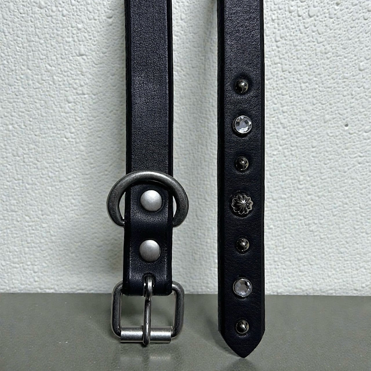 ◾️ クリアスタッズが放つ透き通った輝きが、重厚なブラックレザーに洗練を添える。