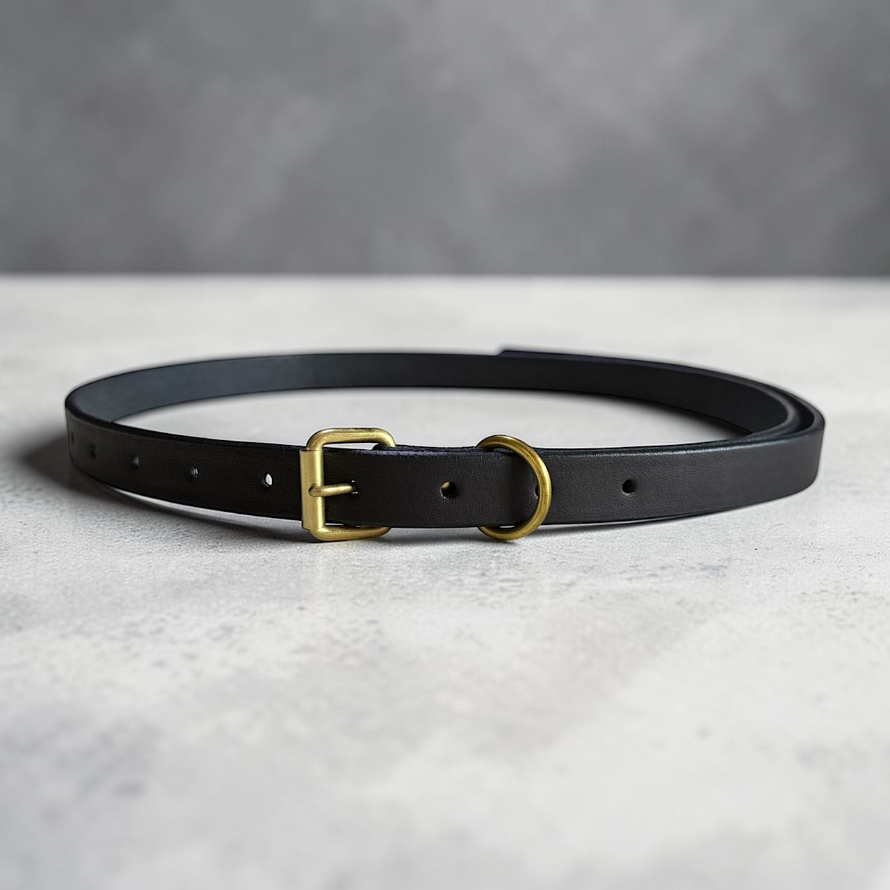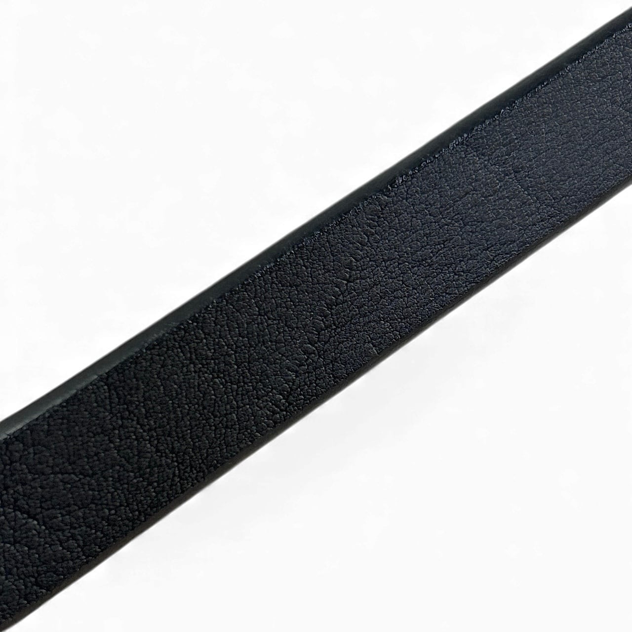 ◾️マットなブラックレザーに、ゴールドの輝きを添えたベルト。シンプルなフォルムに潜むモードな気配と、クラシカルな装飾のバランスが、大人のスタイルに都会的な奥行きをプラスします。モダンシックを体現する一本となっております。