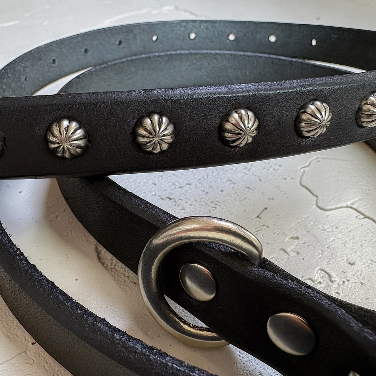 アンブレラ型のUSA製スタッズをハンドカスタムしたナローロングベルトです。(スタッズ15発)